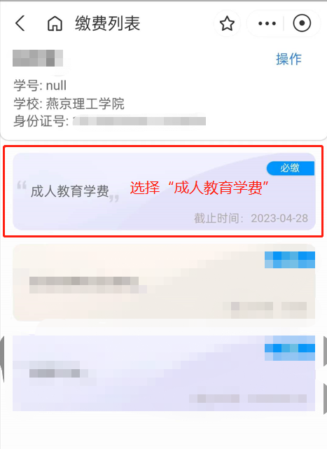 第三步:登录成功后进入缴费页面,选择缴费项目“成人教育学费”