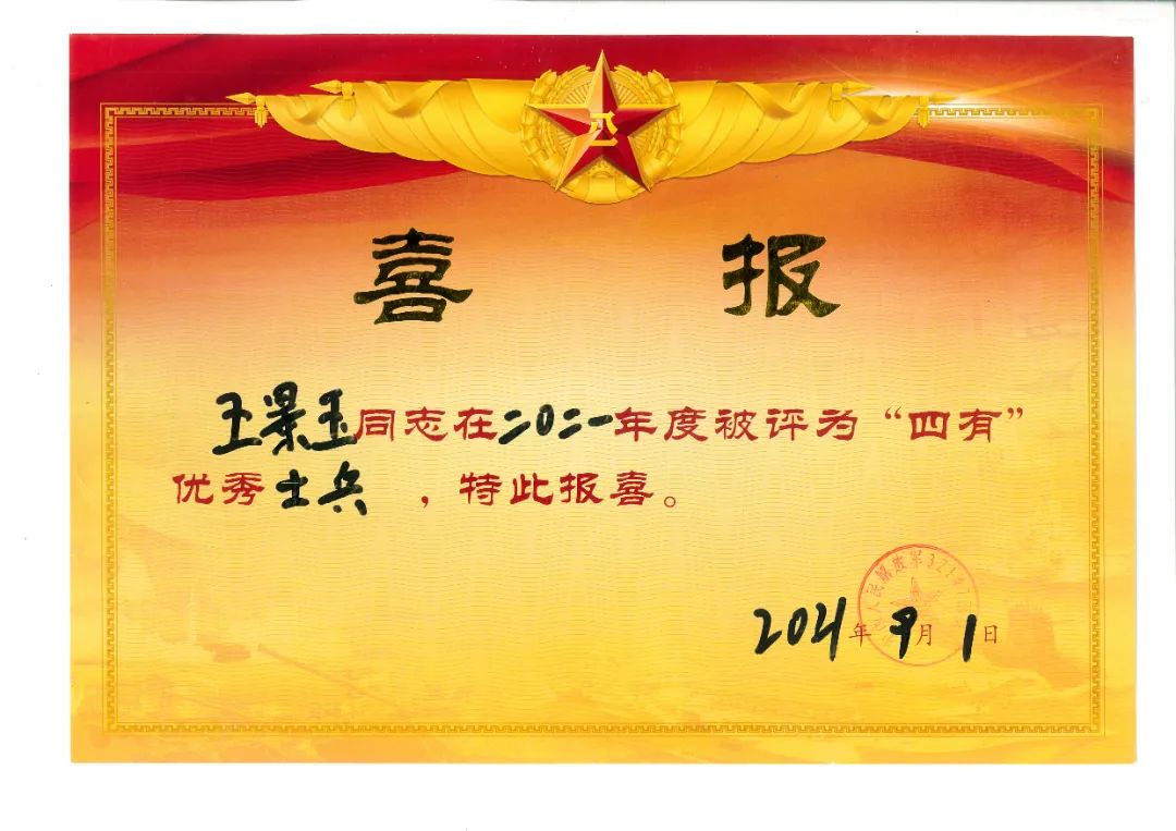 2021年9月因演习任务完成出色被评为四有”优秀士兵;