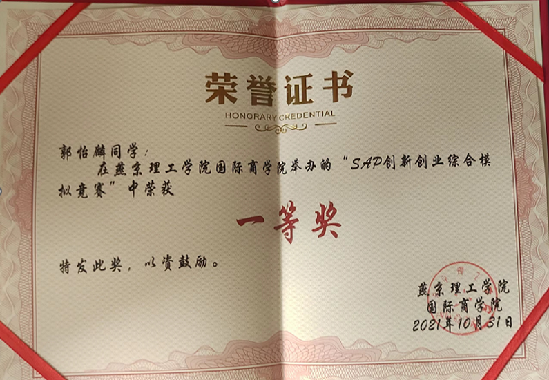 在课余时间积极参加学科竞赛和各种活动来锻炼自己,曾获“斯维尔杯”创新大赛三等奖、构造大赛二等奖、商科文化节竞赛一等奖、新生辩论赛冠军等奖项。