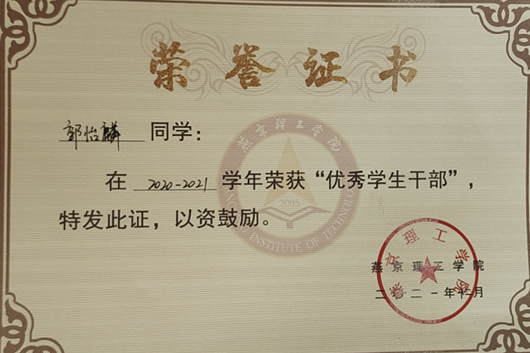 郭怡麟同学的在校感悟和经历是我们每一位同学应当学习努力的方向:“作为新时代青年,我在思想积极要求进步。在大一就递交了入党申请书,通过了初级党课和高级党课的培训,并获得了优秀共青团员称号。作为一名大学生,我认为勤奋踏实,牢记学习是学生的根本任务。大一下学期以来就保持专业第一名的好成绩,连续获得两次校级一等奖学金。