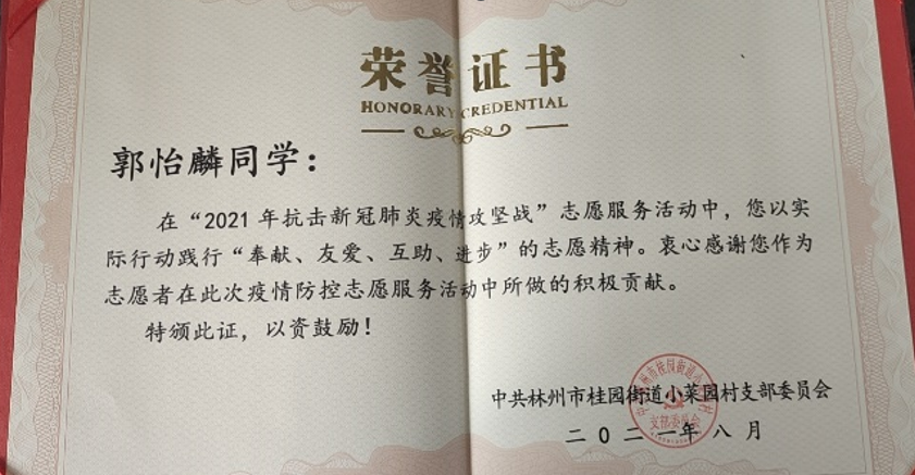 同时积极参加公益活动,获得社区优秀志愿者证书和燕京理工学院“二星志愿者”,并成为林州市大学生联盟活动策划部副部长,为家乡做贡献。