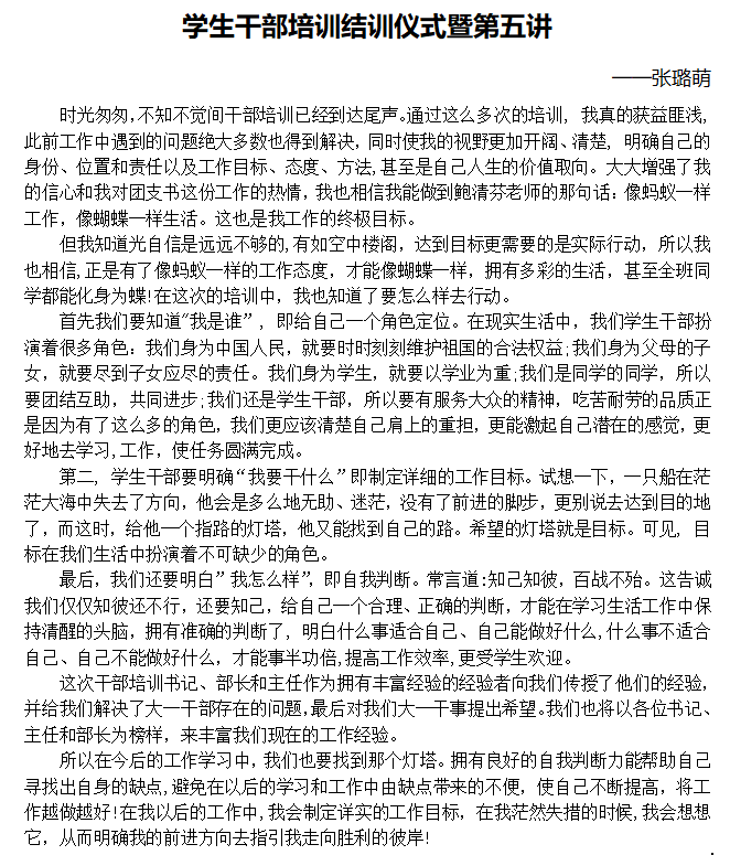 周思诗同学经过四期的学习培训,更深刻认识到:“作为学生干部,首先要有表率作用,只有自己身体力行,才能更好的带动身边的人。”树立为学生服务的意识,谦虚的对待每一位同学,如实的反映同学们的要求,才能更好的表达和维护同学权益。学生干部应该掌握的工作方法:少说多做、虚心学习、具有耐心,细心和责任心,以十分的热情和饱满的情绪去对待工作,认真对待自己的责任和义务,提高效率。她相信“只要努力,我们一定能找到别人不曾走过的路,别人不曾到过的地方,看到别人曾看不到的风景。”