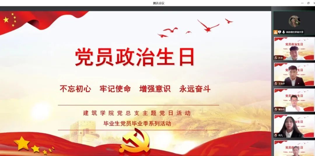 “政治生日”是党员的入党日,自入党之日起,党员的政治生命随之开始。为让党员重新回忆党组织的培养历程,强化党员宗旨意识,提醒党员始终牢记入党时的铮铮誓言,激发党员的工作热情和无私奉献精神。建筑学院于6月10日在线上召开党员“政治生日”主题党日活动。建筑学院党总支书记郭磊、党总支组织委员李雅静老师、党总支宣传委员武天惠老师、党总支纪检委员张美佳老师,以及建筑学院第一党支部的其他老师和66名毕业生党员参加本次活动。