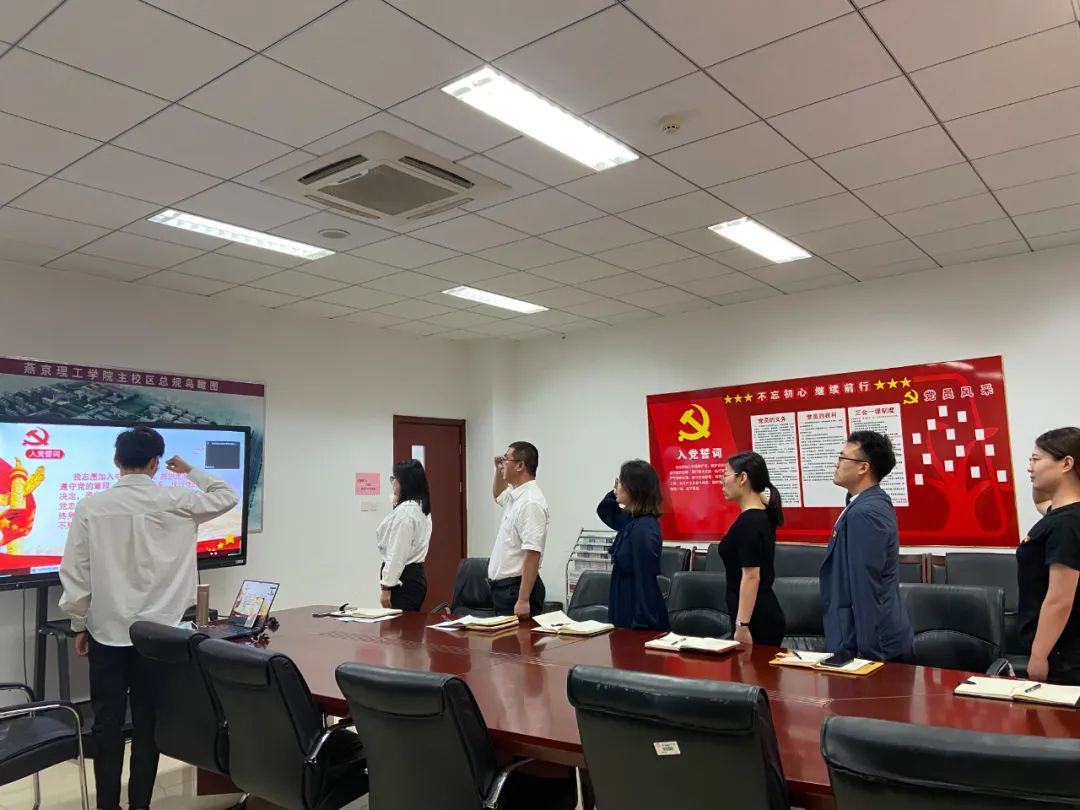 首先,全体党员起立奏唱国歌,党员们用激情澎湃的声音唱出了对国家的自豪与责任感。随后全体党员面向党旗,举起右拳,跟着领誓人共同重温入党宣誓词,党员们整齐嘹亮的声音回响,用铮铮誓言表达对党的忠诚和热爱。