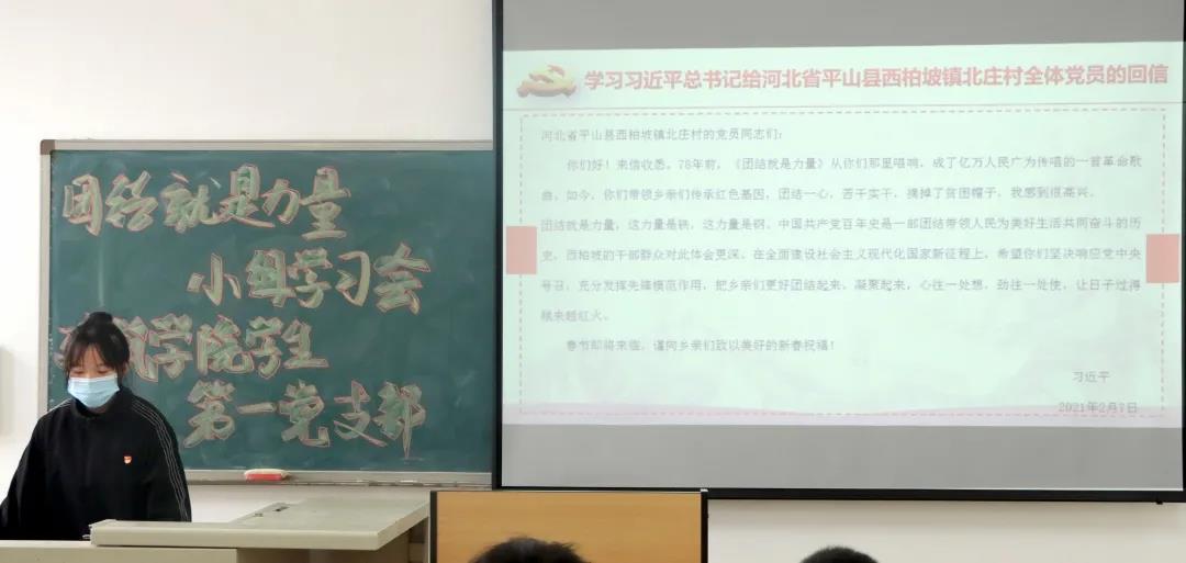 接着,王美佳同志带领学生党员学习了习近平总书记给河北省平山县西柏坡镇北庄村全体党员的回信。78年前,《团结就是力量》从西柏坡唱响,成了亿万人民广为传唱的一首革命歌曲。如今,西柏坡镇北庄村的党员同志们带领乡亲们传承红色基因,团结一心,苦干实干,摘掉了贫困帽子。