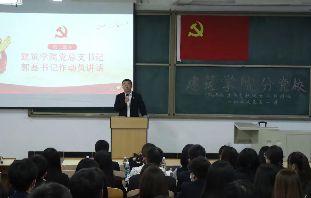 开班仪式在庄严的国歌声中拉开帷幕。首先由建筑学院郭磊书记讲话,郭磊书记强调今年是伟大的中国共产党成立100周年,能在今年成为一名入党积极分子是光荣且幸运的,他对参加本期培训的学员提出了三点希望:第一、在学习、工作和生活中以一名共产党员的身份严格要求自己,真正起到先锋模范作用,发扬入党积极分子的良好风气。第二、团结同学,团结班级,团结宿舍,努力建设建筑学院的“学风”、“班风”、“宿风”。第三、要提高站位,端正态度,集中时间、集中精力,认真学习,努力汲取精神力量。