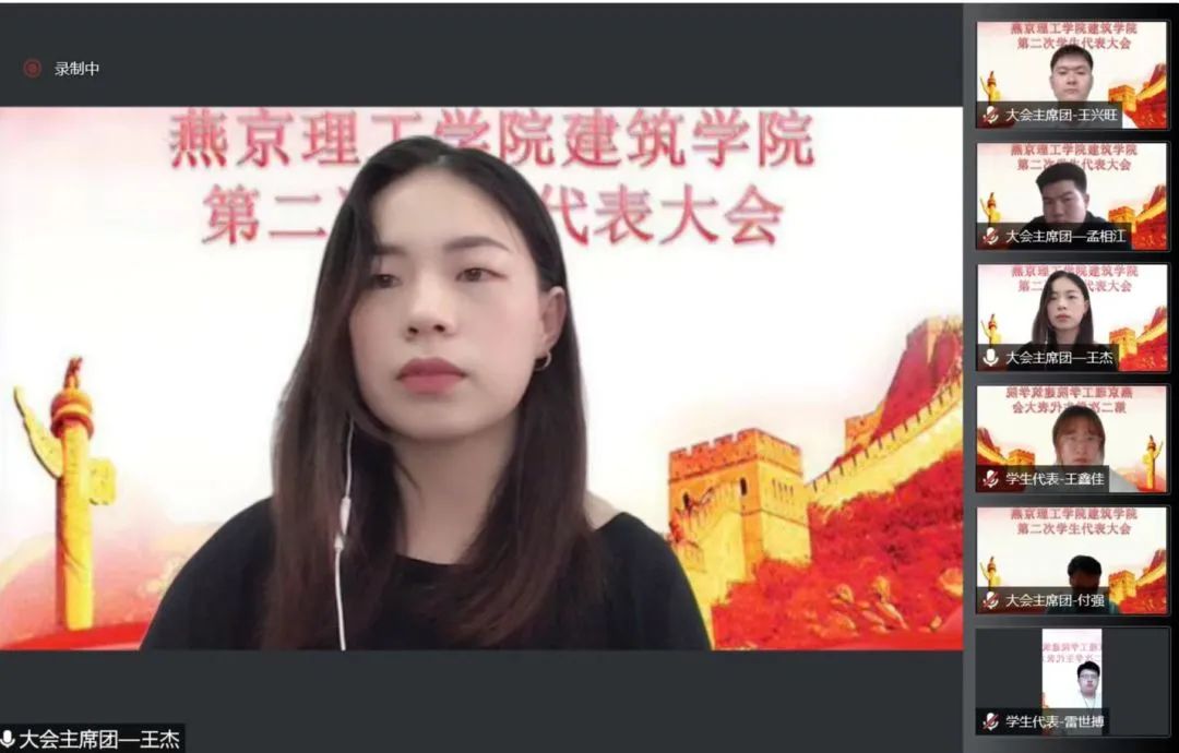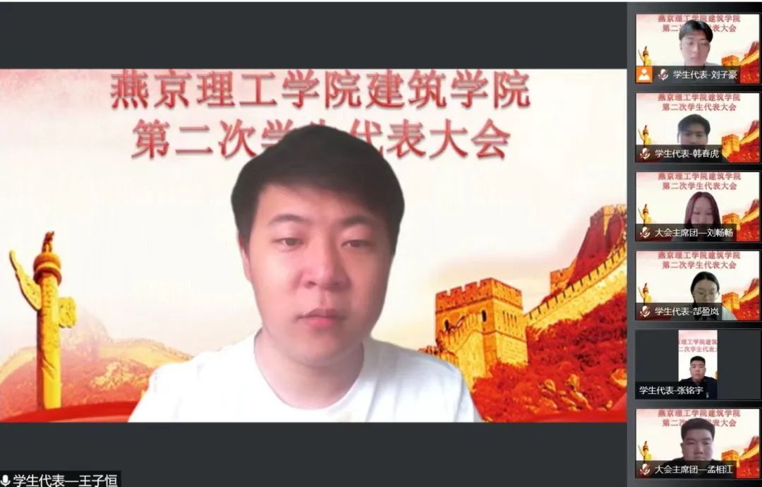 为深入了解建筑学院学生在学习、生活等方面的诉求,充分发挥学生代表的主人翁精神,促进学院各项工作的发展建设,建筑学院于7月8日在腾讯会议上召开燕京理工学院建筑学院第二次学生代表大会。莅临本次学生代表大会的有建筑学院党总支书记郭磊、团总支指导老师张美佳、学生会指导老师付强、辅导员老师王杰,以及建筑学院团学组织主席团成员和学生代表们,并由王子恒、赵天阳、刘子豪、田欢四名同学进行主持。