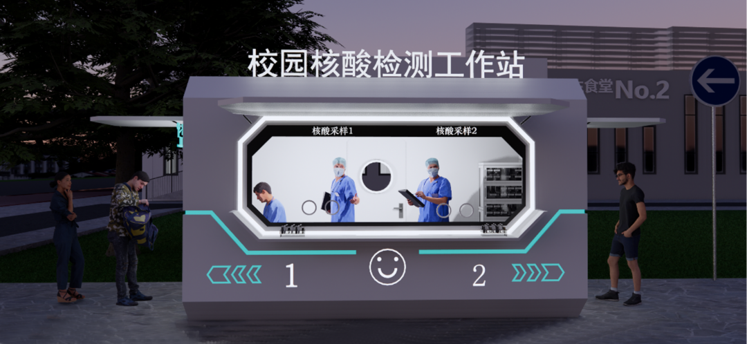 核酸亭设计外观上采用现代化简约的几何造型,为大学校园提供景观和活力。材质采用阻燃性ABS(塑料钢),满足建筑可持续性发展方向。建筑尺度与装配式流程完美契合,便于运输。采用导视系统将被采集人群高效分流,使采集过程更加便捷。在疫情后,也可对其进行功能置换,比如共享图书亭、医疗救助站等形式使建筑得到最大化利用。