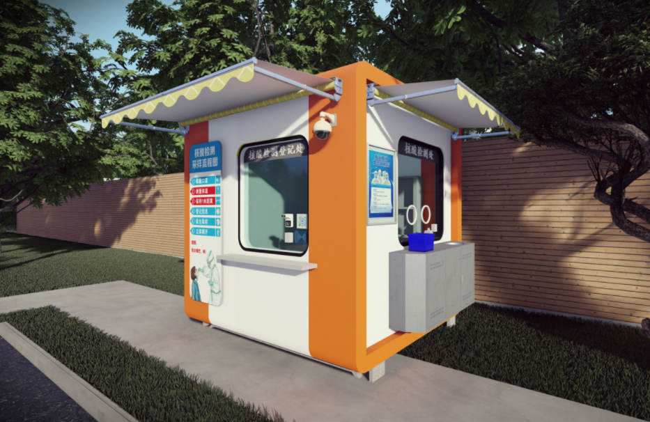 该核酸检测亭应疫情发展,为方便人民群众进行核酸检测以及医护人员硬性需求等,进行一系列设计改造。首先该核酸检测亭可移动,可拆卸,并配备了活动遮阳棚等利民设计。内部功能包括信息录入,核酸检测口,消毒室,试剂存放处等。并且在该亭中运用了太阳能板,以及新风系统等绿色设施,保证了该亭不会对周围环境造成破坏,也不会对使用人群造成伤害。