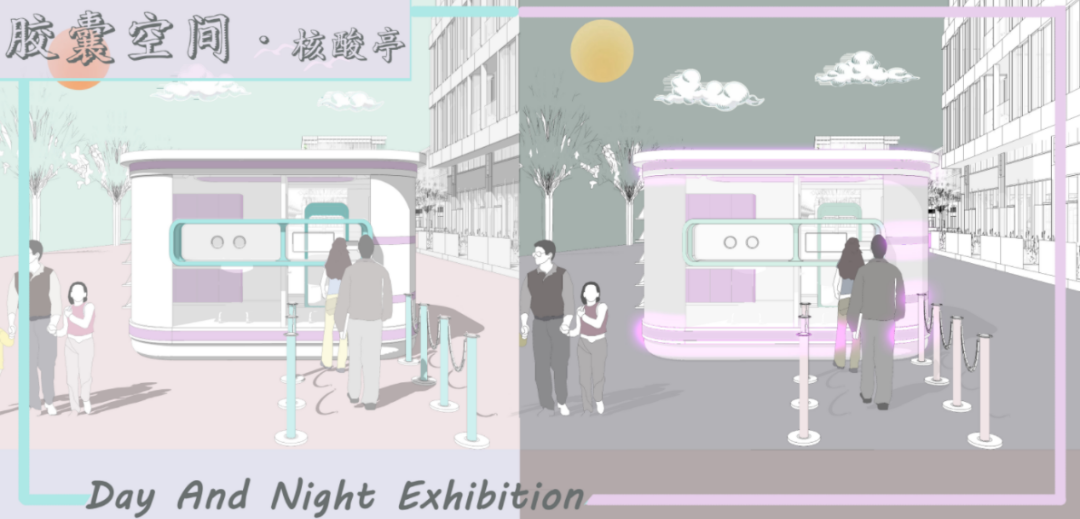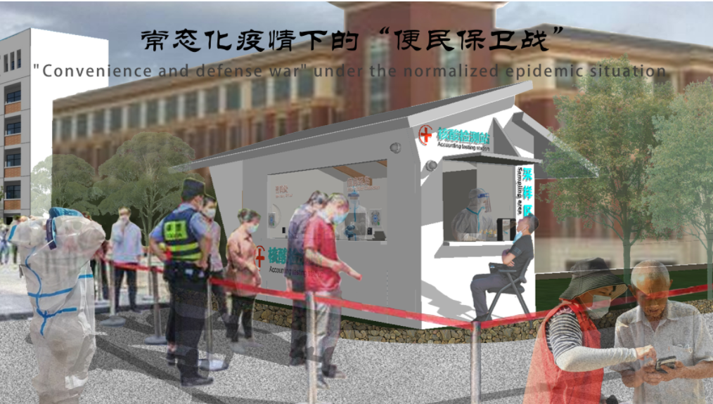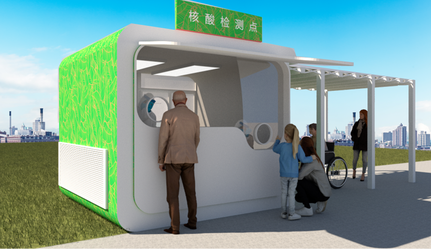 该核酸亭设计中,首先考虑满足核酸检测日常化的公共服务,其次设计点体现在美观与方便,还考虑了“平疫转换”多场景利用方式,在疫情接受之后,便于改造和循环利用和能够在不同城市场景中适应为出发点。