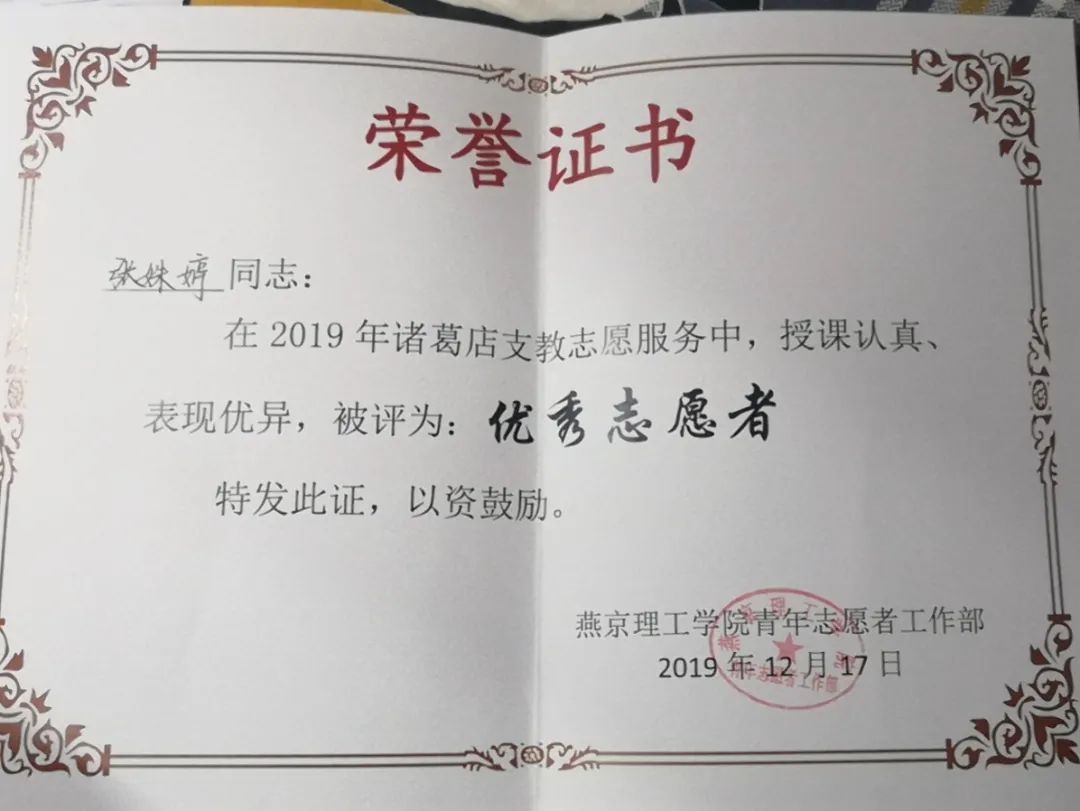 张姝婷同学荣获证书
