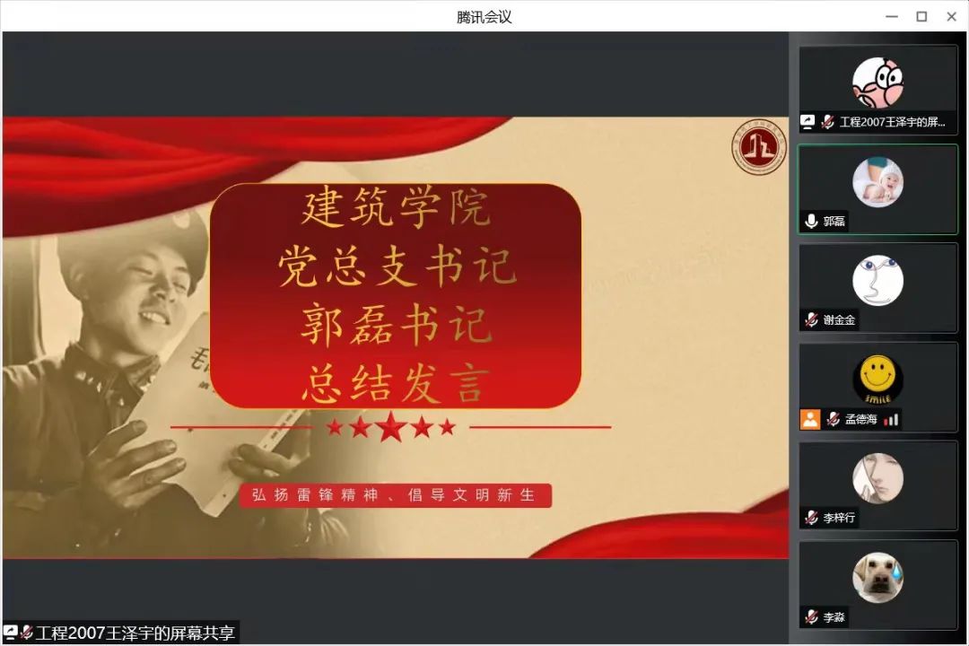 青春扬风采,志愿我先行。最后,郭磊书记做总结,他对同学们在假期间做志愿的肯定,同时鼓励同学们勇于参加志愿活动,把“奉献、友爱、互助、进步”的志愿精神融合在生活中。同时,他对部分同学线上课程未能完成提出批评,他希望同学们能向榜样学习,将学习雷锋与勤奋好学相结合,把崇高的理想信念和道德品质追求融入日常的工作生活,以实际行动书写新时代的雷锋故事,争做新时代的雷锋精神传人。