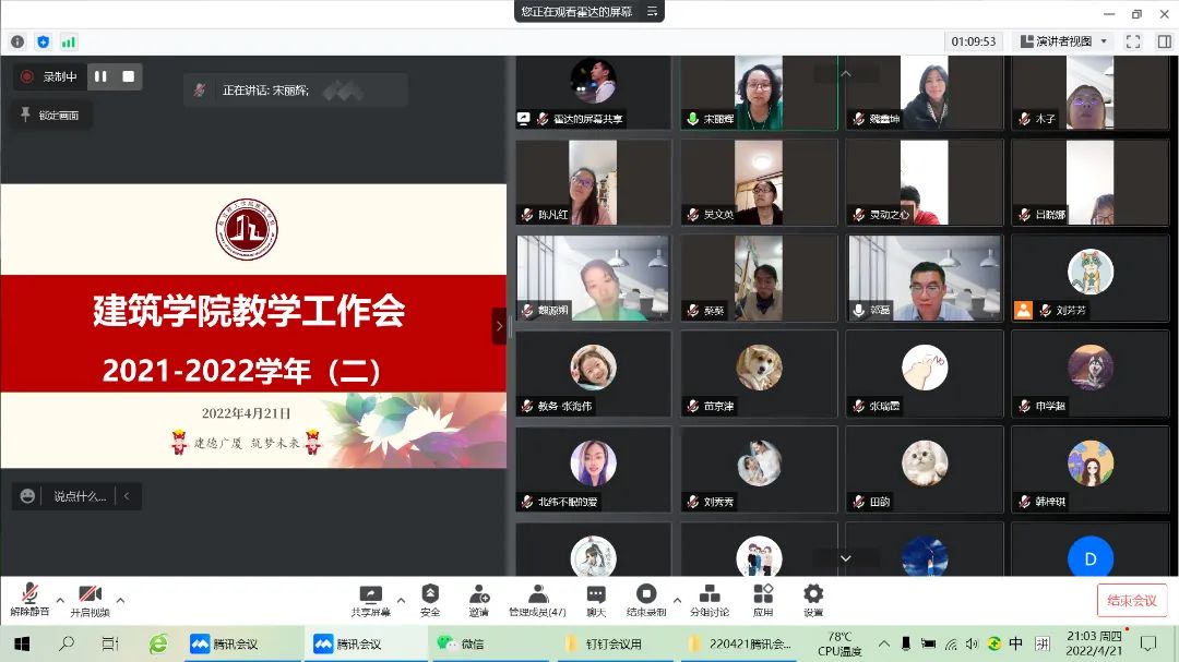为巩固前期教学工作成果,分享经验,分析不足,继续更好地开展后期线上教学及学生实习、毕业等工作。4月21日建筑学院召开了教育教学工作例会。在不影响正常教学的前提下,为确保每位专职教师都能参会,会议定于21日晚20:00召开。本次会议由院长宋丽辉主持,书记郭磊、副院长霍达、院办秘书及全体专职教师参会。