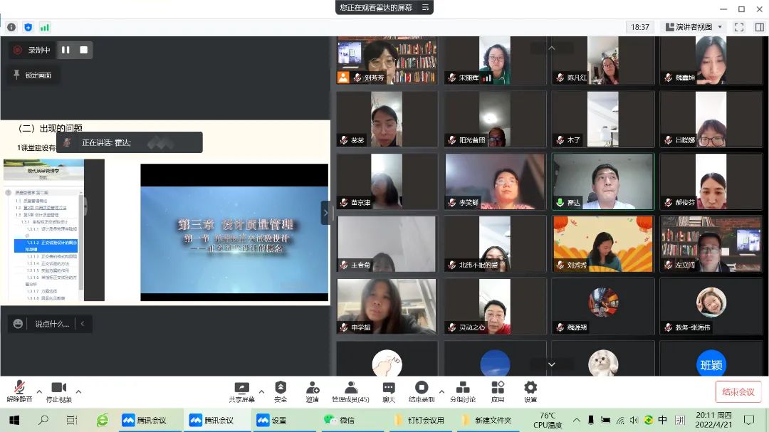 会议开始,宋院长就本次会议主旨做了介绍,开学八周以来我学院线上教学质量整体状况良好,尤其对我学院数学教研室教师刘利欣、左立闯老师提出了表扬,二位老师利用直播加录播的方式,采取问卷、投票、测验、讨论等多方式互动,保证了课堂的活跃度,提高了学生的学习兴趣。同时对存在的一些问题进行了批评,例如录制视频质量不高、利用旧视频,网络视频,上传视频、批改作业不及时、文件名不规范等问题。