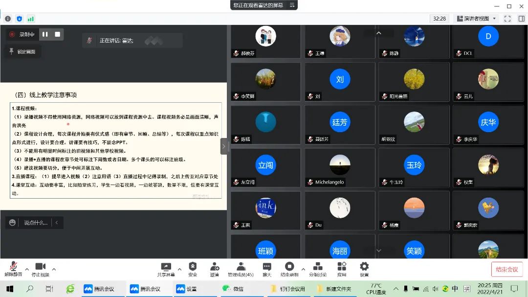 随后,霍副院长从线上教学、实习实训、毕业设计及重修重考四方面进行了近期工作的安排部署。霍院长先从到课率、课程建设等方面对第八周教学检查整体情况进行了通报,对出现的问题进行了汇总并提出了改进措施,分享了优秀教学案例,提出了切分视频、录播加直播课程在章节处标注周数或日期、多个课头标注班级、对特殊学生进行专项监督等提高线上教学质量的建议。霍副院长强调,各位老师要转变思想:线上教学工作已经进入到中期阶段并将成为常态化教学方式。要发挥教师主导作用,增强课堂互动,强化监督机制,保障教学质量。