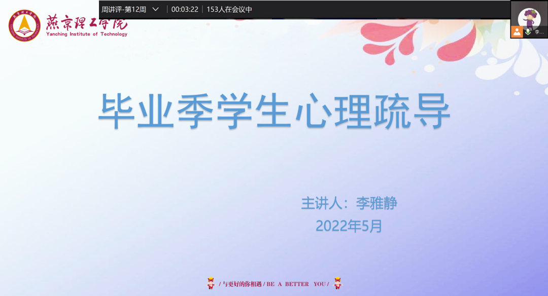因疫情影响,各毕业班学生存在较大的心理压力,部分学生也存在焦虑情绪。建筑学院各毕业班辅导员发现此情况后,组织召开毕业季学生心理疏导班会活动,通过线上交流沟通,了解毕业季学生心理压力的来源,对于现存的共性问题提出解决意见,同时向学生们普及心理健康的重要性,心理健康对于我们的日常生活,人际交往,个人情感都有不可忽略的重要影响。使同学们明白不能忽略心理问题,如存在心理问题,需及时向辅导员或心理健康师寻求帮助,及时解决毕业生心理问题,帮助他们顺利融入社会,实现自己的人生理想和目标。