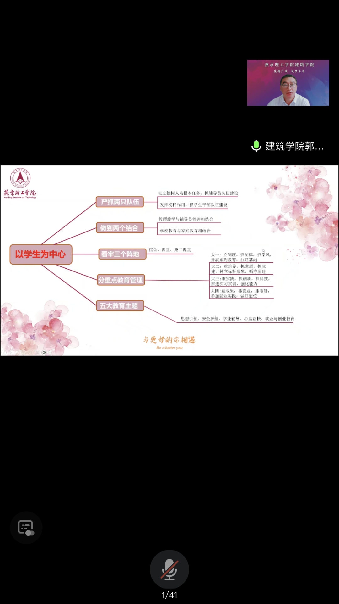 郭磊书记从以学生为中心,以严抓两只队伍、做到两个结合、看牢三个阵地、分重点教育管理、五大教育主题抓手,落实立德树人根本任务。并提出以党建促团建、以安全教育为保障、加强宿舍建设与日常管理、将制度管理与情感教育相结合等九点具体工作方法,向家长介绍了近年来学生工作情况,以及新生报到相关事宜。他强调,遵守学院规章制度是适应大学及个人生涯规划的基础和重要保障;新生要仔细梳理入学报到流程,确保顺利报到,同时要增强安全意识、提高防诈骗能力。学校和学院将竭尽所能为新生提供优质的资源和舒适安全的环境,也请家长与校方和学生持续保持联络,继续关注孩子成长动向,让学生学有所得、学有所成。