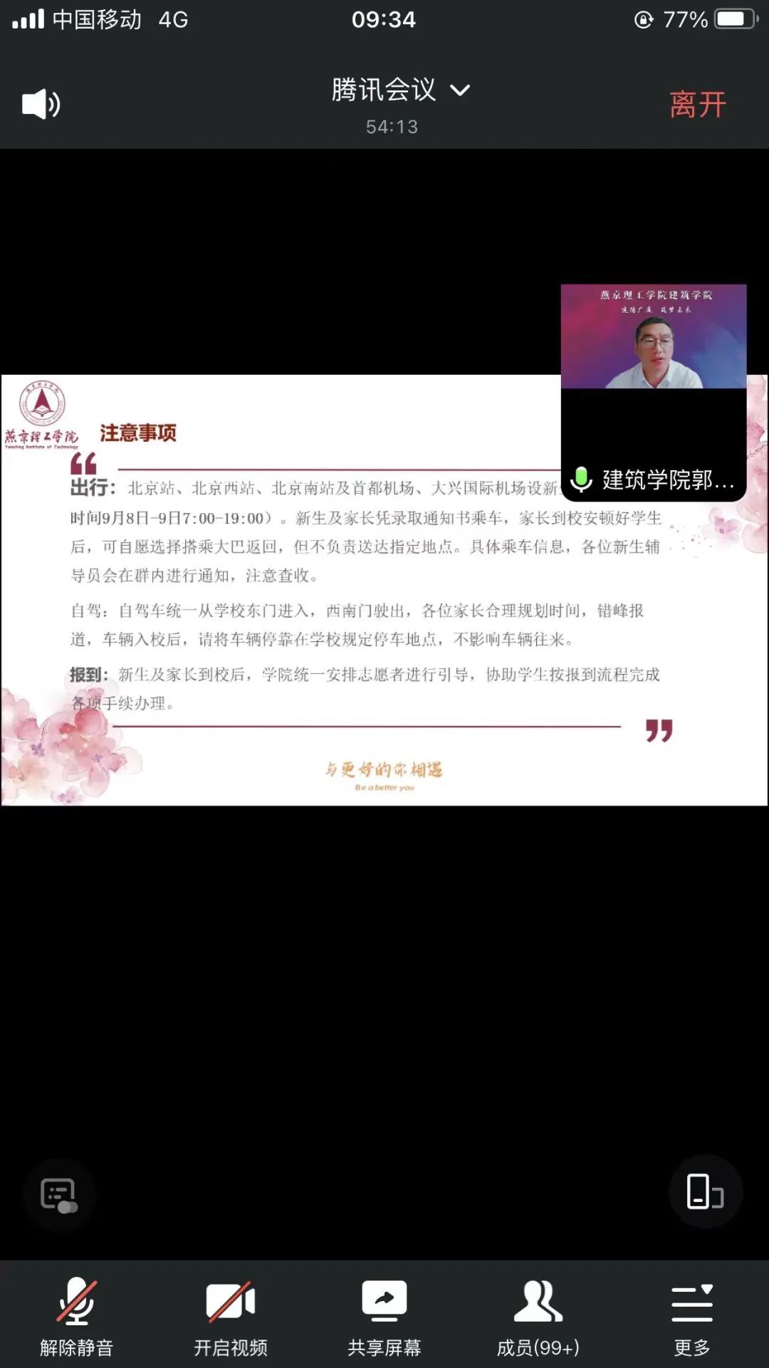 为搭建家校沟通桥梁,增强新生家长对学院的了解,畅通家校沟通渠道、凝聚家校育人合力,共促学生成长成才,建筑学院于9月2日9:00,通过腾讯会议分次召开了2023级本专科新生家长会。建筑学院院长宋丽辉、党支部书记郭磊、副院长霍达、2023级新生辅导员以及全体新生家长参会。会议由党支部书记郭磊主持,与2023级本专科新生家长共话成长。