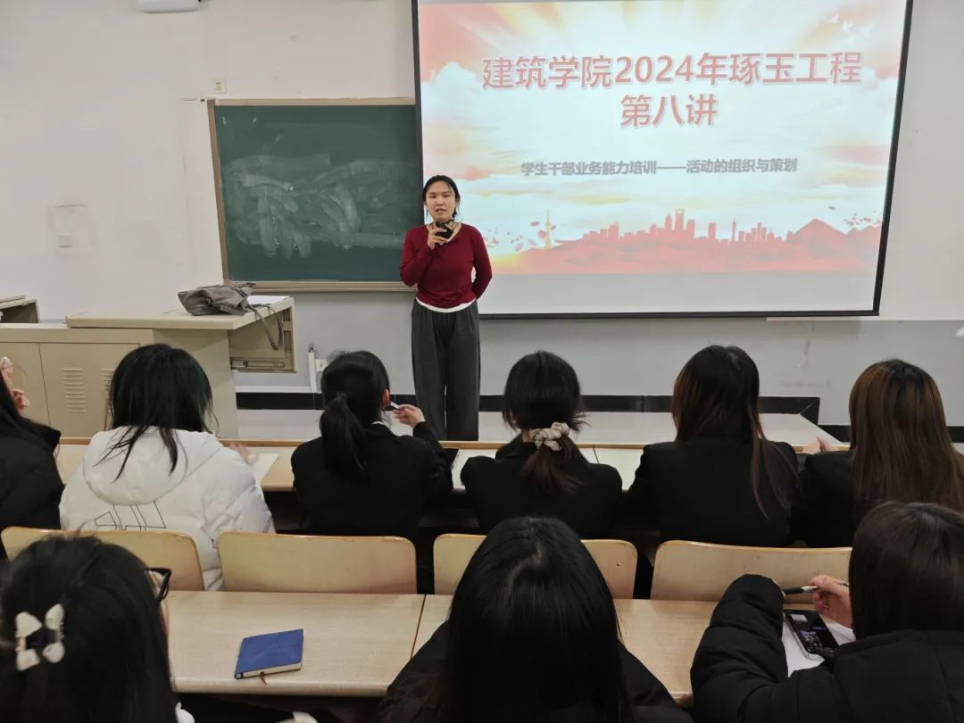 2024年12 月 6 日 ,建筑学院在M303教室举办“琢玉工程”第八讲,内容为学生干部业务能力培训之活动策划和组织。本次培训旨在锤炼学生干部专业素养,强化其活动策划与组织实操技能,主讲人为建筑学院团总支指导老师陈晶蕾。