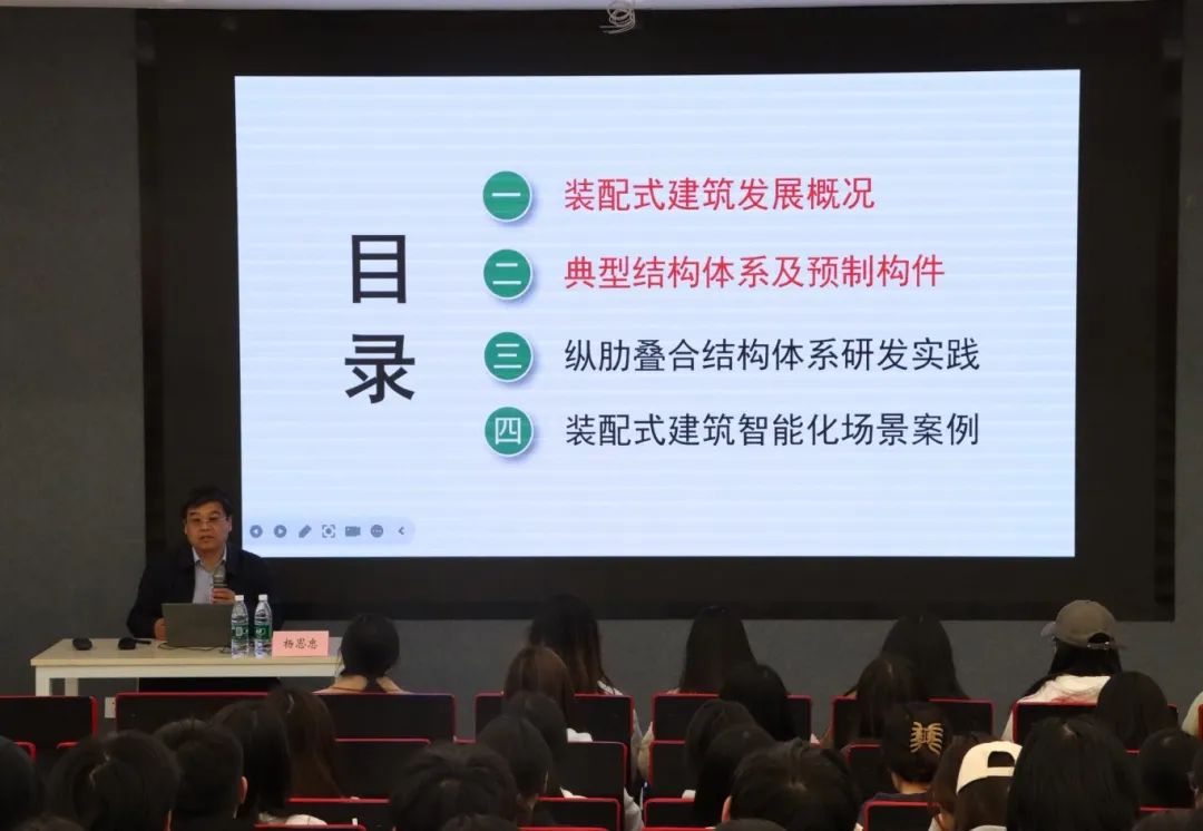 讲座正式开始,首先杨教授主要讲了装配式建筑预制构件发展现状与智能化实践,分为装配式建筑发展概况、典型结构体系及预制构件、纵肋叠合结构体系研发实践、装配式建筑智能化场景案例四个方面。然后从四个方面依次为同学们讲解并且指导,分析了我国可持续发展与装配式建筑发展的联系,装配式建筑发展与智能化相互融合,新型建筑工业化的有利条件能更好地促进发展。