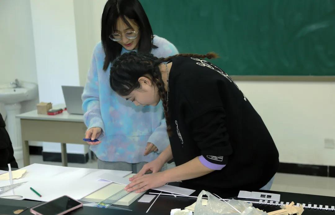 课堂上同学们按照原定分组进行了激烈的讨论,同学们根据模型进行相应结构量的计算,明确的组内分工提高了同学们的效率,同时也提高了团队间的团结协作能力。随后,同学们通过测量、切割、粘贴等方式进行模型的搭建,模型在同学们灵巧的双手中逐渐显现出了雏形。设计建模是每一位工程造价专业的学生必学的专业技能,每一个模型都是同学们互相协作下诞生的结晶。