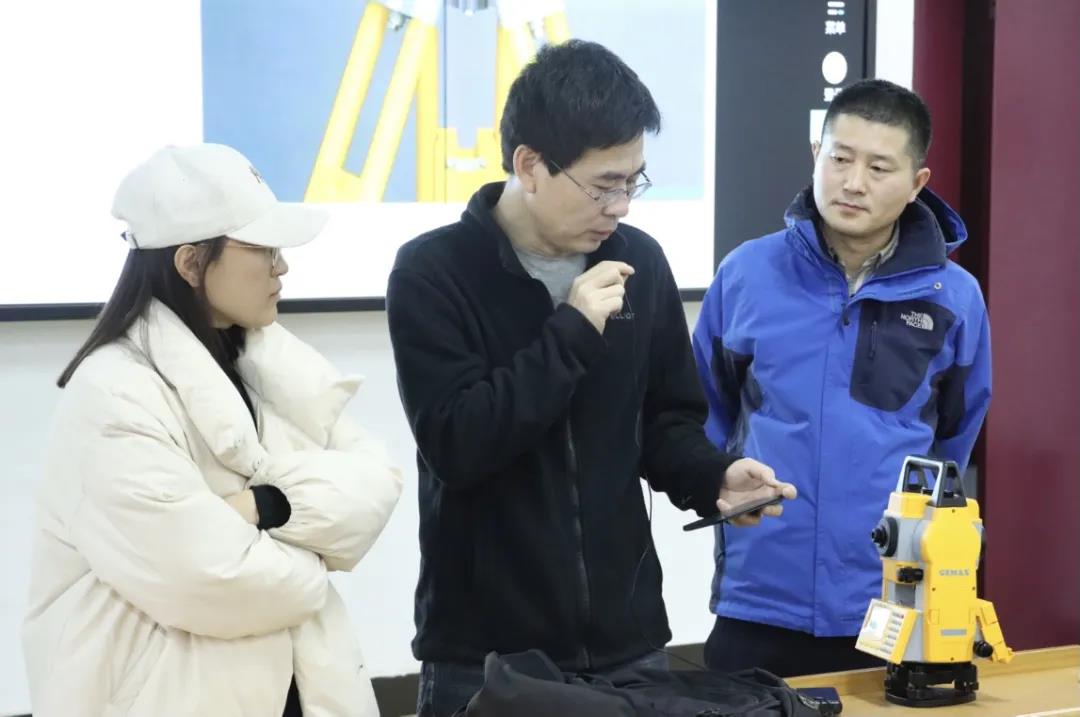 最后,杜忠颖老师为同学们交代了几点注意事项:一、望远镜不能直接被太阳照准,以防损坏测距部发光二极管。二、仪器应保持清洁、干燥,遇雨后应立即将仪器擦干,放在通风处,等待晾干凡迁站均应先关闭电源并将仪器取下装箱搬运。并向同学们具体讲解了全站仪应用于实际生活中的测量方法。