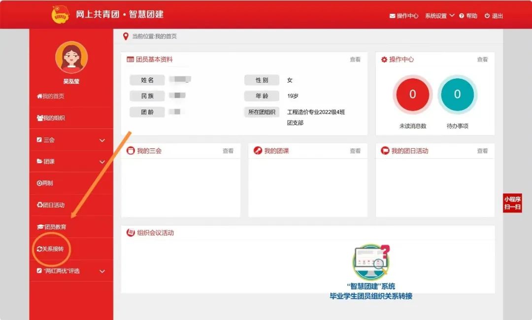 进入个人中心,进行关系转接。“关系转接”,准确选择转入团支部(转入组织为河北省廊坊市三河市燕京理工学院建筑学院2024级新生流动团支部),填写转接原因、团员去向(学习工作单位、地址等),提交即可。