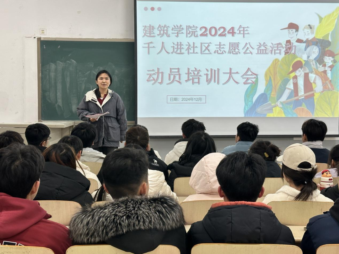 为全力推动2024年“千人进社区”活动顺利开展,12月6日,建筑学校团总支志愿者实践部在 M303 教室成功举办动员培训大会。出席此次培训的有建筑学院团总支书记陈晶蕾、学生会指导老师尤青松和学生志愿者们。