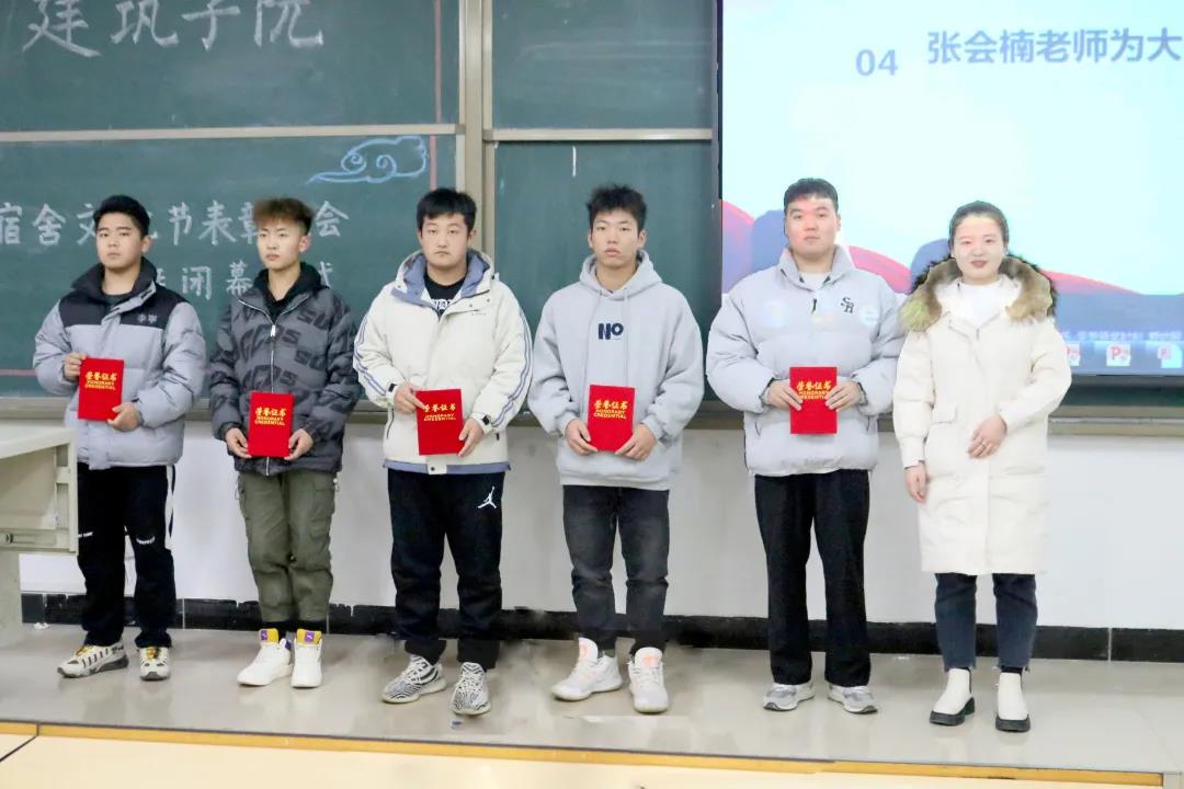 讲话结束后,同学们观看了优秀宿舍的照片和视频,视频中的每个宿舍都在干净整洁的基础上,打造出了属于自己独特的风格,展示了宿舍温馨和睦的氛围。随后,张美佳老师上台宣读获奖名单,由张会楠、张佳玲、付强三位老师分别为大一、大二、大三的获奖宿舍颁发证书并合影留念。