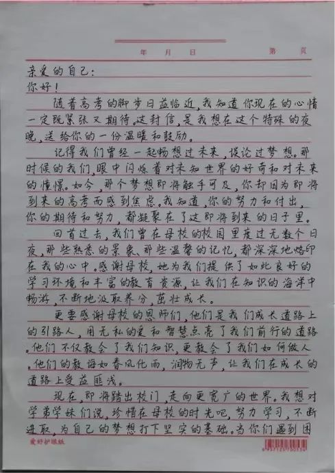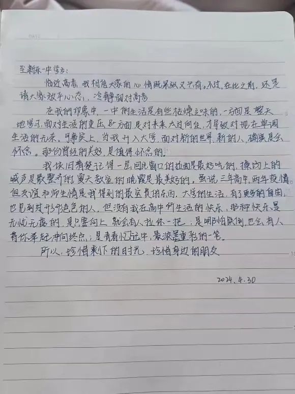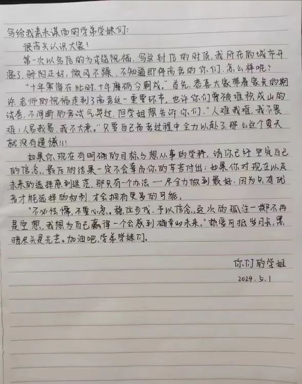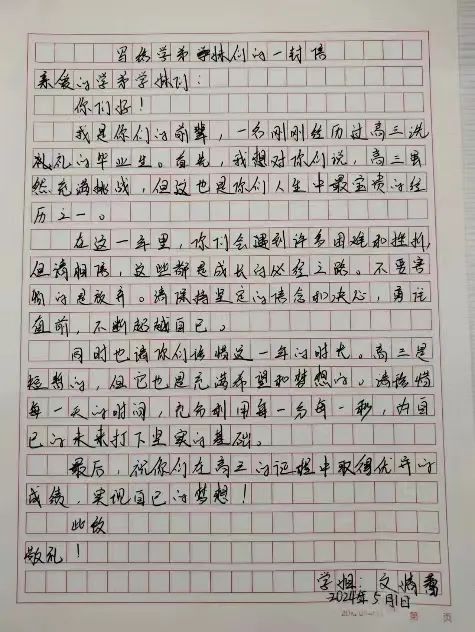 在这次活动中,我深刻的会到了沟通的重要性.每一封信都是我与你们心灵对话的桥梁,我努力在字里行间传递着坚持与希望的力量.我分享了自己在高三时面对压力与挑战的经验也讲述了如何在困境中找到突破口,更表达了对你们未来的美好期许。