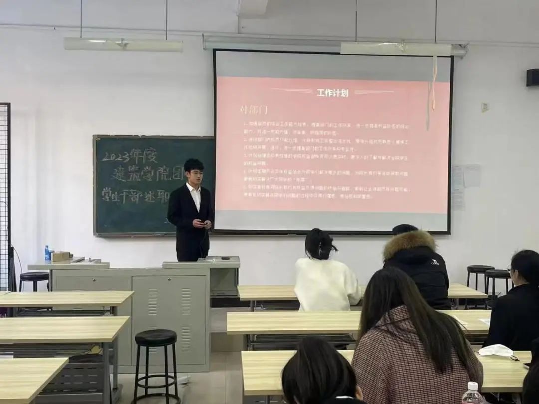 为进一步加强学生组织建设,提高学生干部工作主动性,加强管理与服务水平,12月29日建筑学院于F101召开2023年度团学组织学生干部述职大会。团总支书记陈晶蕾、辅导员老师尤青松及学生组织主要干部参会。各位学生干部依次上台汇报,总结了工作中的收获和不足,并提出今后的改进措施和工作计划。