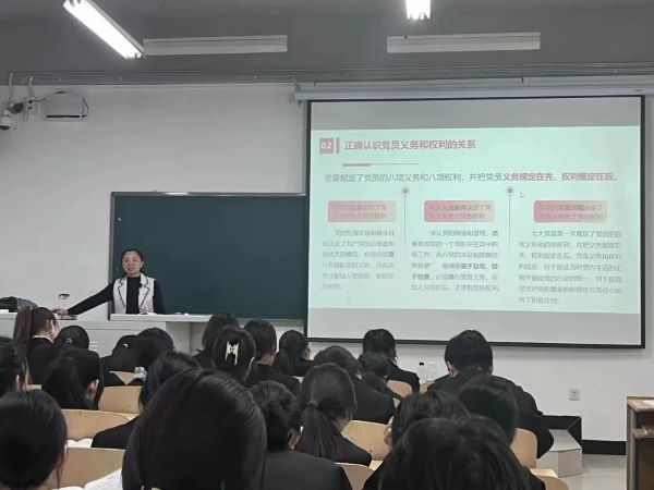 随后,高利岩老师为学员们详细介绍了共产党员的义务和权力,她指出每一个要求入党的青年大学生,都应当了解党员义务和权利的内涵,掌握其本质属性及基本内容,在日常学习、工作和生活中,认真履行自己的义务,正确行使权利,以身作则,做好表率,维护党的形象,以实现中华民族伟大复兴为己任,推动党和国家各项事业不断向前发展