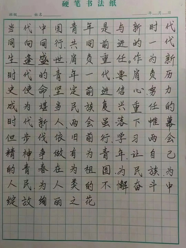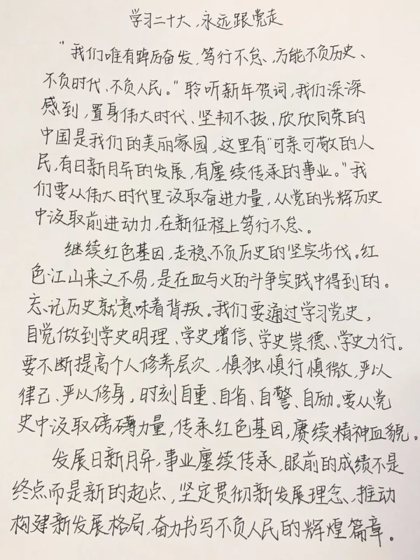 以史明志,以史励行,一幅幅的书法作品向我们展示了那段波澜壮阔的历史,也表明了同学们的爱党爱国之情。同学们在创作书法硬笔的过程,也是对党的历史和使命进一步理解的过程,提升了同学们的动手能力。通过主题教育,增强了同学们的爱国情怀,加深了同学们对党的认同感和使命感,坚定了同学们听党话跟党走的信念。有助于激发同学们对中国共产党的热爱之情,书写爱国华章。