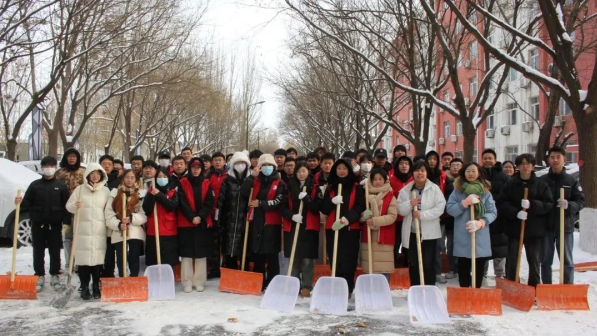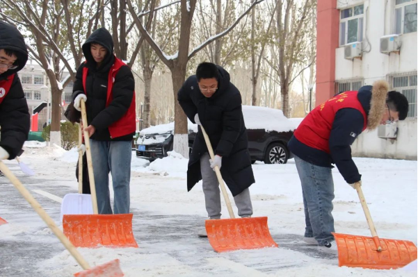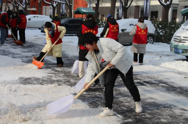 在学院党总支书记的带领下志愿者们纷纷拿起铁锹、雪铲等工具,分区清扫积雪,在扫雪过程中,他们不畏严寒,挥汗如雨,干劲十足,分工协作,共同配合,经过集中奋战,迅速将积雪清理到道路两边,为学校师生铲出了一条安全出行的道路。