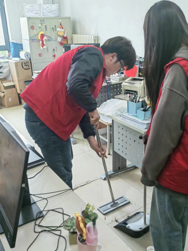 本次活动范围包括办公区域、室外卫生区。志愿者们领取马甲和清扫工具,分组分区打扫。活动现场,志愿者们分组前往不同的办公区域,分工明确、有条不紊的扫地、拖地、倒垃圾、擦桌子,高质量、高效率的完成了此次志愿活动。