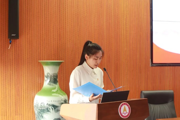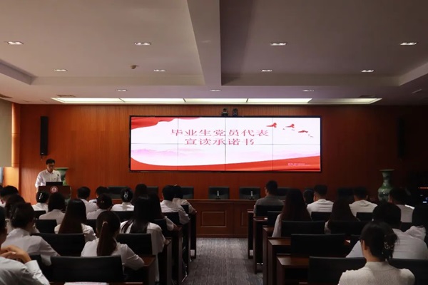 毕业生党员代表田善理宣读承诺书,将认真学习党章党规,贯彻执行党的路线方针政策,对党忠诚,维护党的团结统一,积极投身实践,服务人民群众,带头践行社会主义核心价值观,做一名合格的共产党员。
