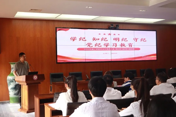 会计学院党总支书记胡国超为全体毕业生党员讲授党纪学习教育专题党课,授课围绕《中国共产党纪律处分条例》,从在全党开展党纪学习教育的通知和相关要求;《条例》修订情况;如何内化于心、外化于行等三个方面进行讲授,引导毕业生党员深刻认识开展党纪学习教育的重要意义,进一步强化纪律意识,加强自我约束。