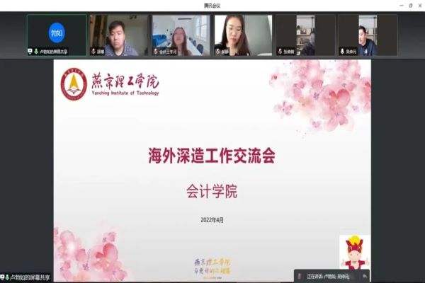 2022年4月29日上午,会计学院海外深造交流会在线上召开,会议由会计学院海外深造专项负责老师卢勃如主持,参加人员有国际教育学院院长吴仲元及会计学院全体辅导员老师。