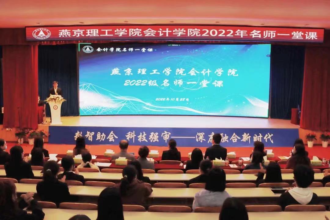10月28日上午,第五届会计文化节暨“数智助会 科技强审”——深度融合新时代论坛,活动期间,举办了“名师第一堂课”。习近平总书记指出,中国青年要系好人生第一粒扣子。对于刚步入大学校园的大一新生,也要上好大学的第一堂名师课。“名师一堂课”是燕京理工学院面向大一新生开展的一项教育教学特色品牌活动,是我们学校展现办学特色、提升新生专业认知的深度与广度、开阔专业视野的重要举措。“名师一堂课”活动为大家提供了一个与知名专家教授面对面接触的机会。本次活动有幸邀请到了首都经济贸易大学杨世忠二级教授、中国政法大学王燕祥教授、防灾科技学院袁庆禄教授为22级新生进行了名师一堂课。