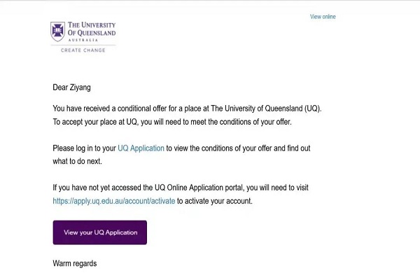 于子洋获得昆士兰大学(2021QS排名47)、