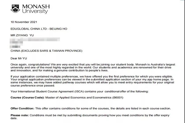 近日,会计学院1802班于子洋陆续收到来自昆士兰大学、莫纳什大学、萨塞克斯大学的offer,成功牵手世界名校,在燕理实现从本科到世界名校硕士的华丽转身。
