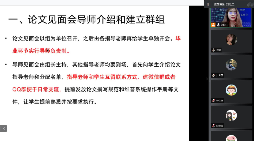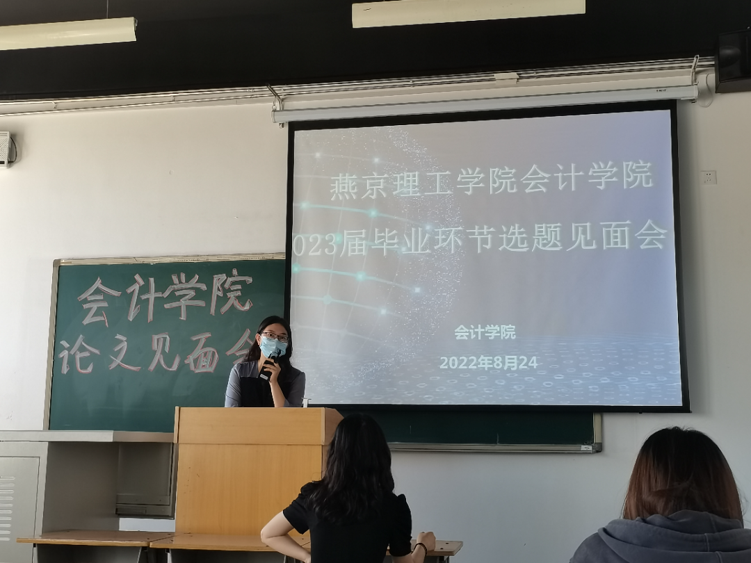 秋日更胜春朝,见面会上指导老师们首先对毕业论文整体工作进行了布署,鼓励同学们在秋季新学期以积极的态度迎接毕业论文各个阶段的任务和挑战。其次,指导教师为同学们布置了现阶段最主要的选题工作,在师生双向选题的原则指导下,强调了选题要求及其重要性。对论文整体写作思路和框架进行了分享,让同学们理论结合实践,利用自己所学会计学专业知识去分析实习公司的实际情况,提高分析问题和解决问题的能力。最后,指导教师为同学们分享了毕业设计管理系统操作方法和毕业论文撰写规范,以确保全体同学能够熟练进行系统操作,及时提交各个阶段相关资料,高质量地完成毕业论文的撰写。