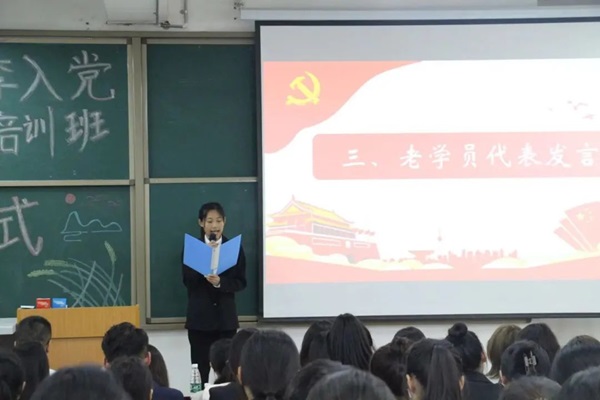 其次由老学员代表范馨岳发言,范馨岳同学讲到作为一名入党积极分子要努力学习,提高党性修养,增强服务意识,强化社会责任感,提升个人素养,用党的科学理论武装自己,用党的初心使命感召自己。以实际行动践行誓言,发扬党的优良传统,争做骄傲的燕理人,争当新时代创造者。