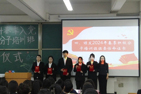 接着颁发2024年春季积极分子培训班班委任命证书。2024年春季积极分子培训班共计85人,分为四组,任命崔晨悦为班长,史润、孟凡峥、付依菲、梁伟悦四人为组长,由燕京理工学院党办副主任吴丹为他们颁发班委任命证书,并合影留念。