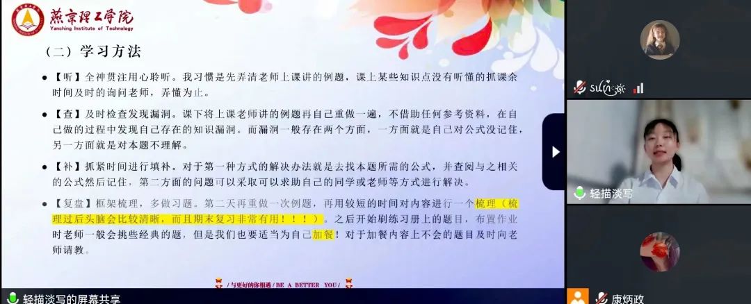 进入“青年有话说”,由会计学院学生会主席杨潇宇同学主讲《新时代的中国青年》白皮书,国家奖学金获得者刘思琪同学介绍《学习经验分享》。她们共同提到大学是连接学校与社会的桥梁,专业知识的学习和工作能力的锻炼同样重要,让学生干部深刻明白自身的责任与义务,要敢于担当,勇于实践,同时兼顾好学业与工作。作为新时代青年承载着国家与民族的希望,我们要用实际行动阐释青春的蓬勃力量,以扎实的专业知识和能力,为社会主义现代化建设和实现中华民族伟大复兴的中国梦贡献青春力量。