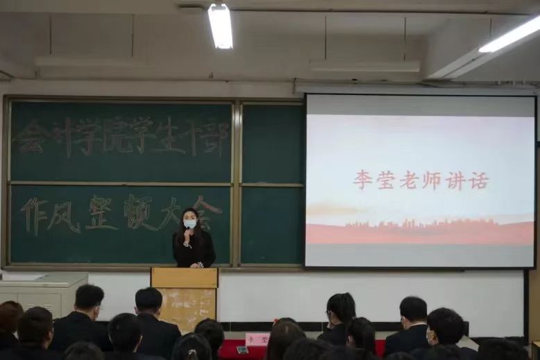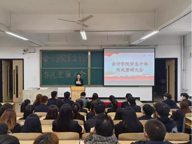 弘扬新风正气,优化干部作风。为了进一步提高学生干部服务意识、增强自我约束能力、摒弃不良风气,深化思想建设,整顿作风纪律,会计学院于2022年10月26号在E202教室召开了学生干部作风整顿大会。会计学院党总支书记胡国超、学生会指导老师李莹、院各组织学生干部以及21、22级核心班干部参加此次会议。