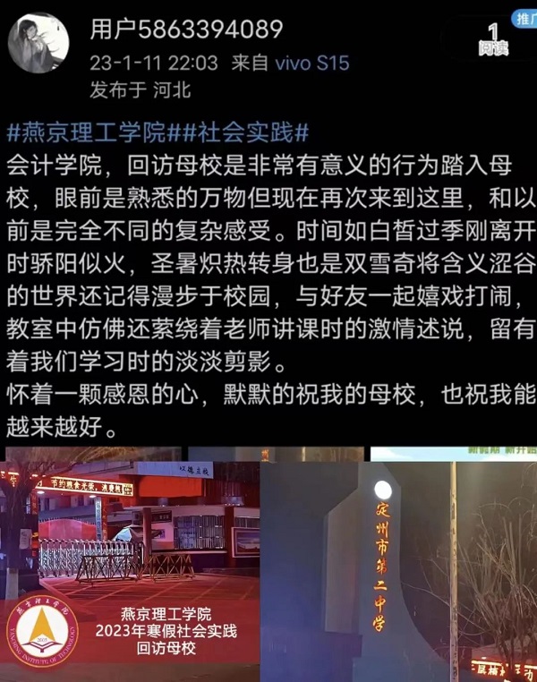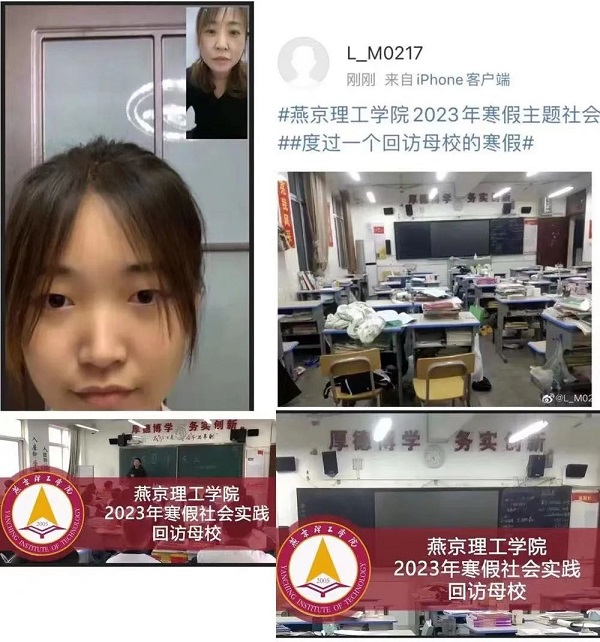 我的母校是石家庄市第二十四中学,也叫石家庄七一学校,虽然没有面对面的交流但是我仍然感到非常紧张,看着一张张陌生而又熟悉的脸庞我似乎又看到了当年的自己。在介绍燕京理工学院之前,我先问了他们心目中有没有自己想要去的大学,既有人说有也有人说没有,但是说没有的占大多数。他们简直和我太像了,我甚至在高考结束以后都没有搞清楚自己想去的大学是哪里。在给学弟学妹们介绍完燕京理工学院之后我突然感慨万分,学弟学妹们的未来还是充满可能性的,愿我们心有方向不再迷惘赢得一个更好的人生。其实我非常感谢这次寒假社会实践活动,在毕业以后都没有怎么去找过高中班主任,通过这个活动我跟班主任好好地叙了叙旧,谈了谈心并对班主任表达了感谢之情。