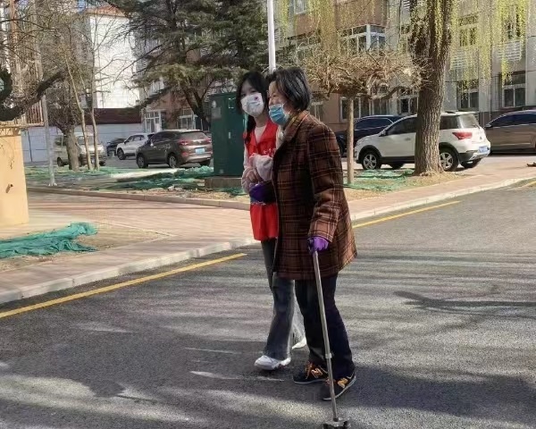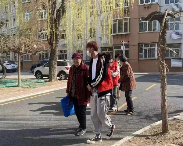 在暖暖秋日的阳光下,团总支的志愿者们来到社区陪伴老人。有的志愿者搀扶着老人慢慢走过静谧的小路。