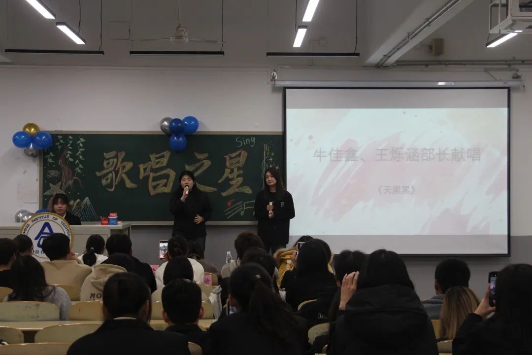 评分之际,文艺部部长牛佳鑫、王烁涵演唱了《天黑黑》为选手助兴。