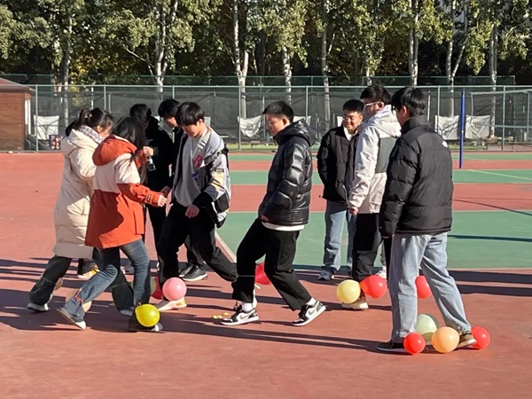 队长负责分成4人一个小组,组员每人在脚腕上绑3-4个气球,每组互踩其他组气球,并保护自己的气球。每场比赛10分钟,比赛结束后,保留气球最多的组获胜。这项活动让同学们充分认识到团队协作的重要性,增强同学们的集体意识。